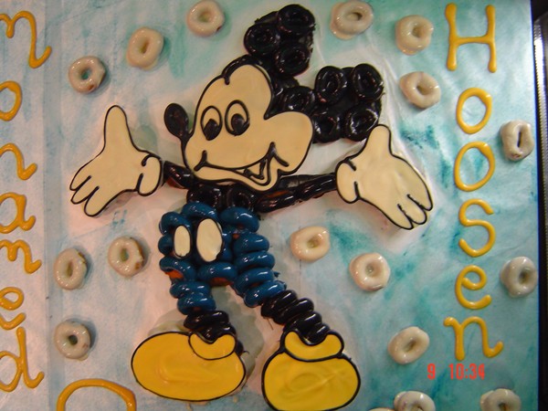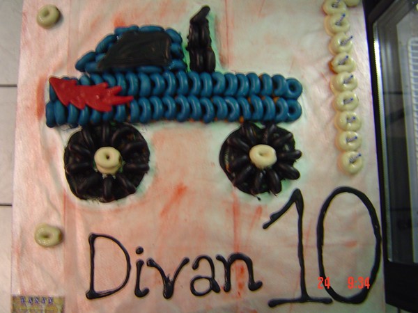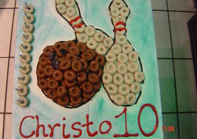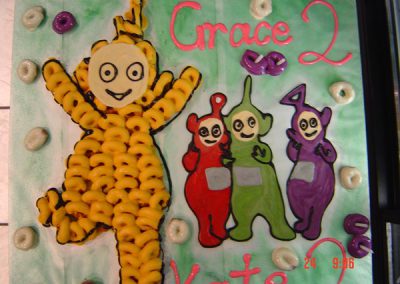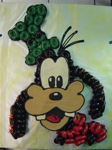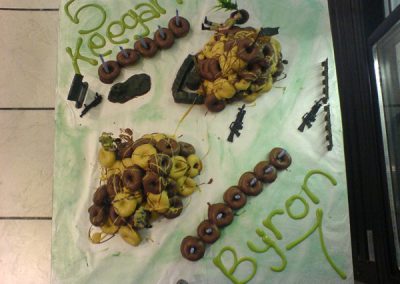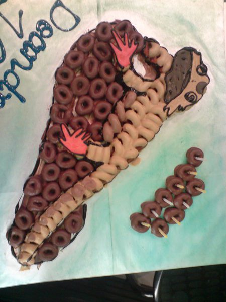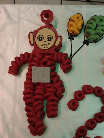 Beautiful themed birthday cakes made out of donuts. We use white chocolate sauce that we colour – so no icing sugar.