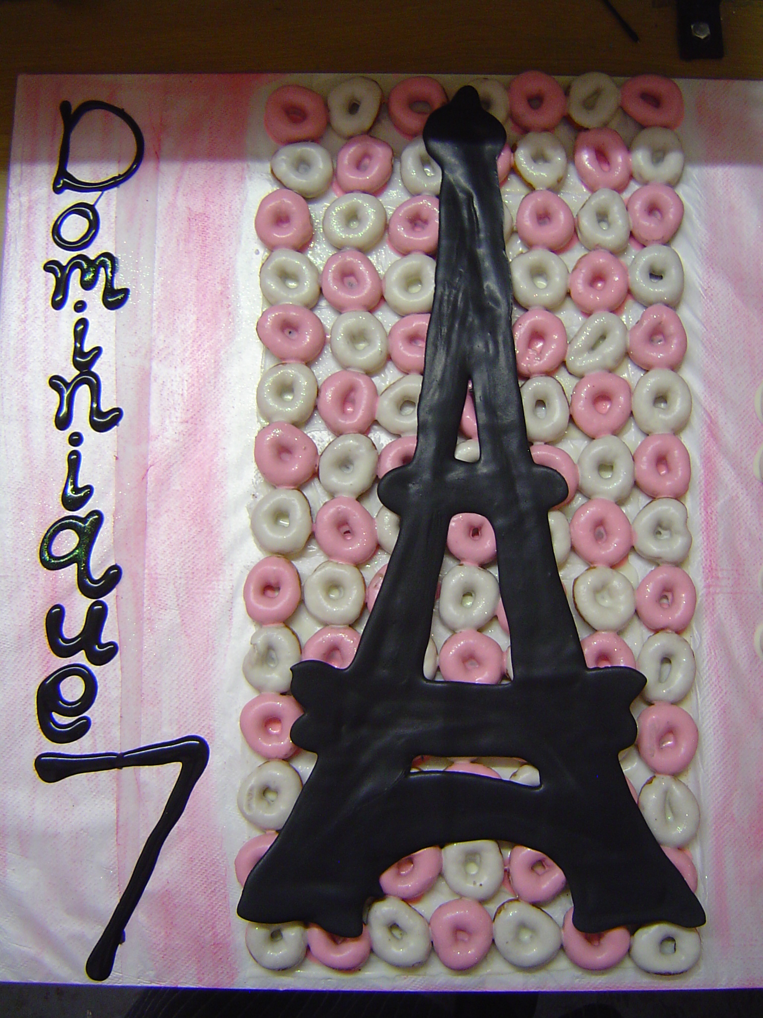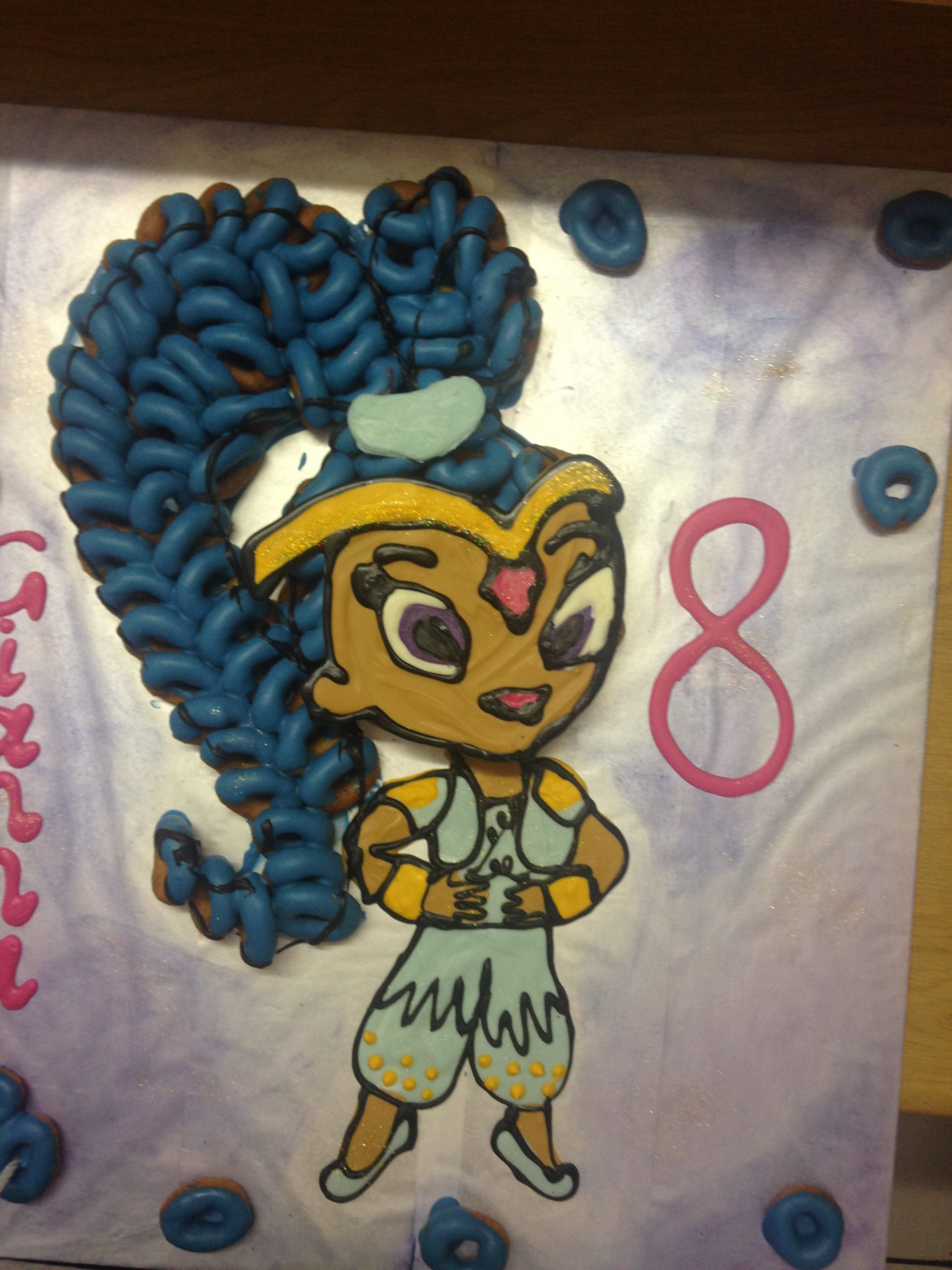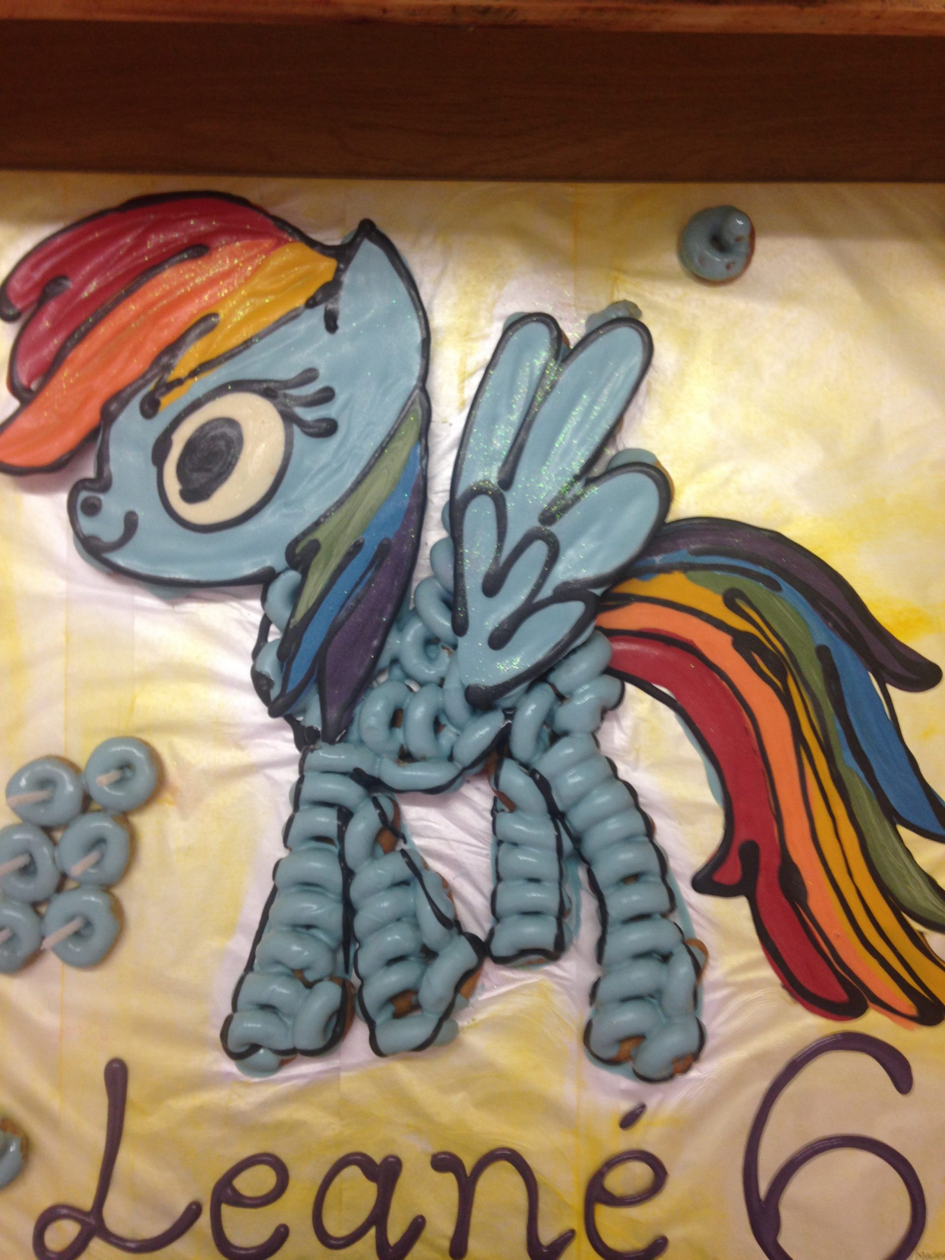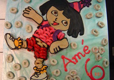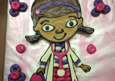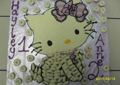 Beautiful themed birthday cakes made out of donuts. We use white chocolate sauce that we colour – so no icing sugar.